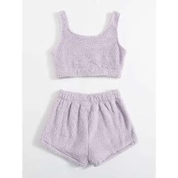 Indulge in ultimate comfort with the SweatyRocks Women's Fuzzy Pajamas Set, designed for those chilly autumn nights and cozy winter days. This delightful two-piece ensemble features a luxuriously soft fleece sherpa fabric that wraps you in warmth, making it perfect for lounging at home or stepping out in style. The set comprises a trendy crop tank top paired with matching shorts that boast an elastic waistband for flexibility and ease of wear. Available in a charming lilac purple hue, these...