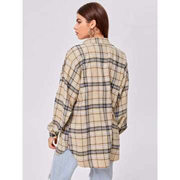SweatyRocks Women's Long Sleeve Collar Long Button Down Plaid Shirt Blouse Tops Light Khaki Small