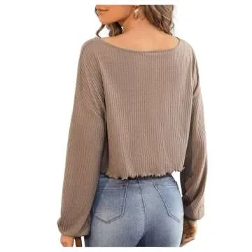 SweatyRocks Women's Long Sleeve Tee Shirt V Neck Ribbed Knit Lettuce Trim Crop Top Mocha Brown M
