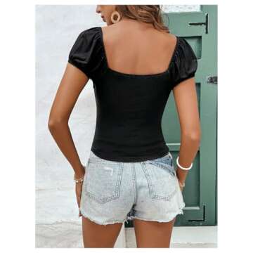 Features: Ruched Front, Square Neck, Short Sleeve, Cap Sleeve, Puff Sleeve, Contrast Lace, Slim Fit, Plain, Solid Color, Casual Elegant T Shirts