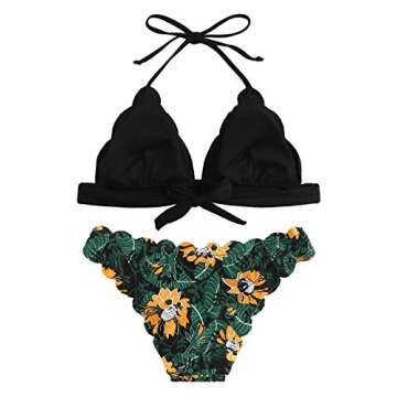 SweatyRocks Women's Sexy Bathing Suits Scallop Halter Bikini Top Floral Print Two Piece Swimsuits Black Floral Large