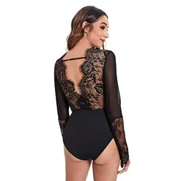 SweatyRocks Women's Sexy Lace V Neck Clubwear Top Sheer Mesh Long Sleeve Bodysuit