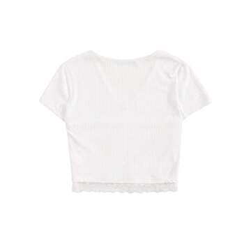 Show more Elevate your wardrobe with the SweatyRocks Women’s Sexy V Neck Lace Hem Ribbed Knit Tee Shirt Crop Top in White. This versatile crop top combines elegance and comfort, making it a go-to staple for any occasion. With its delicate lace hem and flattering V neck design, this tee offers a perfect blend of style and sophistication. Crafted from high-quality ribbed knit fabric, it ensures a snug yet breathable fit, allowing you to flaunt your shape while staying comfortable all day long. Whether paired with high-waisted jeans, skirts, or shorts, this crop top effortlessly adds a chic touch to your outfit.