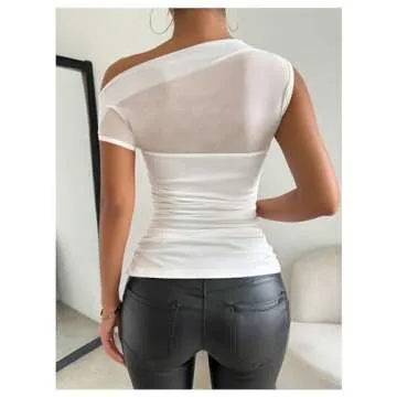 SweatyRocks Women's Sheer Mesh Asymmetrical Neck T Shirt Ruched Short Sleeve Tee Tops White Small