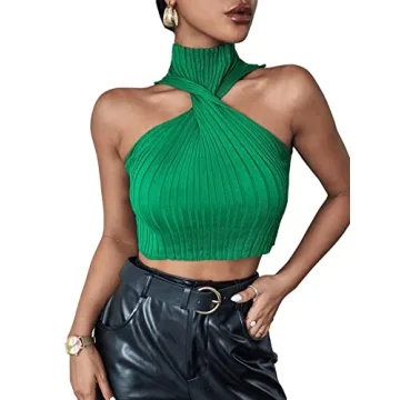 SweatyRocks Women's Sleeveless Halter Twist Front Crop Top Slim Fit Ribbed Knit Vest Tank Tops Green S