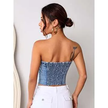 SweatyRocks Women's Strapless Button Down Slim Fit Denim Crop Tube Top with Flap Pocket Light Wash L