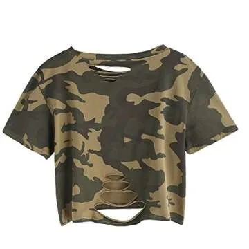 SweatyRocks Women's Summer Short Sleeve T Shirts Distressed Ripped Crop Tops Green Camo M