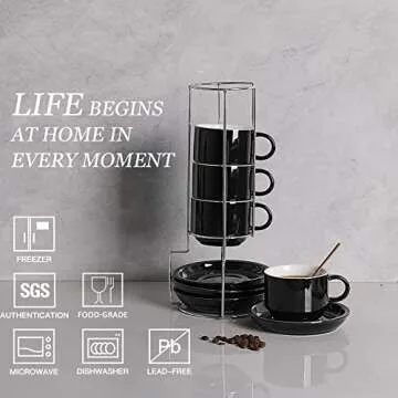 Sweejar Ceramic Espresso Cups with Saucers, 4 Ounce Stackable Cappuccino Cups with Metal Stand for Coffee Drinks, Latte, Tea - Set of 4 (Black)