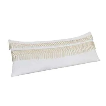 Show moreTransform your living space with the enchanting Sweet Jojo Designs Boho Bohemian Macrame Tassel Ivory Accent Decorative Couch Long Throw Zipper Body Pillow Cover. Measuring 54 inches by 20 inches, this exquisite pillow cover effortlessly blends elegance with a touch of rustic charm. Crafted from 100% soft cotton, it is not only breathable but also machine washable, ensuring that maintaining its beauty is a breeze. The hidden zipper closure allows for seamless insertion and removal, making it perfect for decorating your couch or bed with minimal hassle. This pillow cover is adorned with stunning Boho Chic Macrame knotted fringe trims in an elegant off-white cream color, adding a sophisticated touch to your decor, whether it’s a farmhouse style or a sleek urban aesthetic.