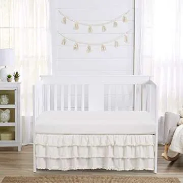 Show more Transform your baby's nursery with the stunning Sweet Jojo Designs Ivory Boho Bohemian Girl Baby Nursery Crib Bed Skirt Dust Ruffle. This exquisite bed skirt measures an impressive 52 inches x 28 inches x 15 inches, providing a perfect fit for most standard cribs. Crafted from 100% cotton, it features a beautiful solid ivory finish that adds a touch of elegance to your child's room. The charming knotted tassel macrame fringe and the ruffled three-tier design elevate the aesthetics while ensuring it blends seamlessly into a variety of nursery styles, from minimalist chic to farmhouse charm.