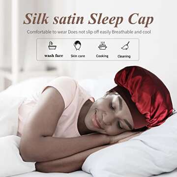 Show moreIntroducing the **SWEET VIEW 4 Pcs Silk Bonnet Satin Bonnet** – your ultimate hair care companion! Available in a captivating array of colors including **black, navy, purple, and red**, these bonnets not only protect your hair but also complement your sleepwear perfectly. Crafted from **100% silk satin**, the luxurious fabric mimics the texture and softness of genuine silk, preventing hair breakage while ensuring you stay cool and comfortable throughout the night. Each bonnet measures **14.6 inches** and features an **elastic band design** that accommodates head circumferences ranging from **19 to 24 inches**, providing a snug yet gentle fit for everyone.