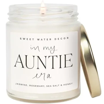 Show more Ignite fond memories and envelop your space in delightful aromas with the "In My Auntie Era Candle" from Sweet Water Decor. Crafted with high-quality soy wax, this 9oz candle is designed specifically for aunts who deserve to be celebrated. The harmonious blend of Jasmine, Rosemary, Sea Salt, and Honey creates a soothing fragrance that not only elevates the ambiance but also evokes feelings of warmth and love. With a burn time of over 40 hours, this candle ensures that the comforting scent fills your space long after it's lit. The chic clear jar with a gold lid adds a touch of elegance to any decor, making it a perfect accent piece in your home or office.