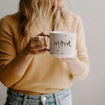 Show more Discover the elegance and charm of the Sweet Water Decor Mom Coffee Mug, a 17oz fine bone china masterpiece designed with both aesthetics and functionality in mind. This exquisite mug features a trendy honeycomb pattern accented by shimmering gold text, making it the ideal companion for your morning coffee or afternoon tea. The beautifully crafted gold handle not only provides a luxurious touch but also completes the overall stylish look of the mug, making it a standout piece in your kitchen or office. Its thoughtful dimensions (4" x 3.5", 5.5" with handle) and stackable design allow for easy storage while maintaining an effortlessly chic appearance. Designed in the USA and crafted with care, this mug is the perfect statement piece for any occasion.