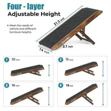 Show more Introducing the ultimate solution for pet owners looking to provide their furry friends with safe and convenient access to higher places! This pet ramp is perfect for older or arthritic pets, helping to reduce muscle and joint tension that can occur from jumping. Designed with adjustable height options, the ramp can be set at four different heights of 10, 13, 16, and 18 inches, making it easy for pets to reach their favorite spots like cars, beds, or sofas. At the highest setting, 18 inches, it is ideally suited for cats.