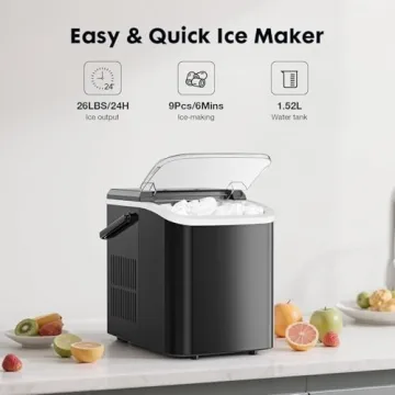 Show more Introducing the Sweetcrispy Countertop Ice Maker Machine – your ultimate solution for quick and convenient ice production! Designed for modern living, this ice maker stands out not just with its sleek coal black finish but also for its outstanding functionality. In just 6 minutes, you can enjoy 9 bullet-shaped ice cubes, ensuring you never have to wait long for your cold beverages. With a remarkable capacity of up to 26.5 pounds of ice in just 24 hours, say goodbye to those tiring trips to the store for ice and embrace the ease of having fresh ice on demand. Its self-cleaning feature ensures you enjoy clean and safe ice with minimal effort, making it suitable for bustling kitchens, lively parties, or quiet evenings at home.