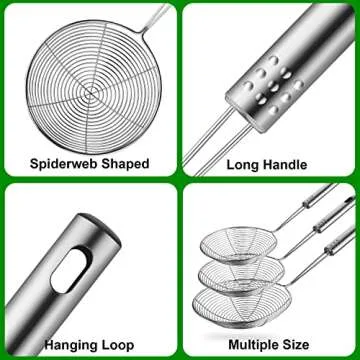 Show more Introducing the **Swify Spider Strainer Set of 3**, your ultimate kitchen essential designed to elevate your cooking experience! Crafted from premium high-quality **stainless steel**, this strainer set combines durability with functionality, making kitchen tasks easier and more efficient. With its robust net wiring and sturdy framework, these strainers are built to last, ensuring they won't react with foods, keeping your culinary creations safe and delicious. The set includes three versatile sizes—**4.3 inches, 4.9 inches, and 5.7 inches**—allowing you to tackle a variety of kitchen tasks from frying crispy potato chips to straining pasta for your favorite dishes.