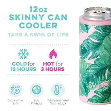 Show moreThe Swig Slim Can Cooler in the vibrant Palm Springs design is a must-have accessory for those who appreciate style without sacrificing functionality. Perfectly crafted from thick, double-walled, vacuum-sealed stainless steel (304 grade 18/8), this can cooler promises to keep your beverages cold for over 12 hours, making it ideal for hot beach days, pool parties, or simply enjoying a refreshing drink in the backyard. Its sleek design not only fits most popular slim can beverages, including hard seltzers, energy drinks, and sodas, but also adds a splash of color and personality to your drinkware collection. With easy-to-use features and effortless cleaning, the Swig Slim Can Cooler is not just about looks—it’s about functionality and performance.