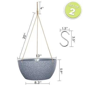 SwinDuck 13 Inch 2 Pack Large Hanging Planters for Indoor Outdoor Plants, Plastic Hanging Basket Pots for House Plants Flowers, Grey