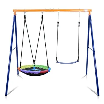 The swing set includes one 32" saucer swing, one belt swing seat, and a heavy-duty A-frame stand.