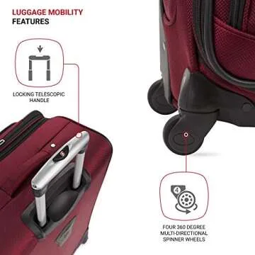 Show moreIntroducing the SwissGear Sion Softside Expandable Luggage – a prestigious blend of durability and style designed to elevate your travel experience. Measuring 22.75 x 14.25 x 10.25 inches, including wheels and handles, its compact size ensures it fits snugly in overhead compartments. Constructed from scuff-resistant polyester fabric, this chic suitcase is not only stylish in its rich burgundy color but also robust enough to withstand the rigors of travel. The 360-degree multi-directional spinner wheels offer effortless maneuverability, allowing you to glide through busy airports and tight spaces with ease, making your journey more enjoyable.
