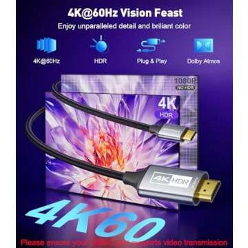 Show more Introducing the SWITCHFLUX USB-C to HDMI Cable - your ultimate solution for high-speed and high-definition connectivity. This 6-foot cable is designed to support stunning 4K visual effects at resolutions up to 3840x2160@60Hz, delivering extraordinary HDR clarity that immerses you in a true cinematic experience. Whether you are streaming your favorite movies, giving a presentation, or gaming, the effortless transition to a larger display will leave you in awe. With its robust construction and superior technology, this cable provides perfect audio pass-through for an unparalleled viewing experience.
