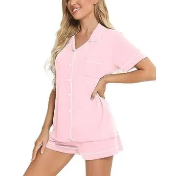 Show more Indulge in the ultimate comfort with our women's sleep set shorts, crafted from Modal fabric that consists of 95% Rayon and 5% Spandex, making it ultra-soft, lightweight, and stretchy. This luxurious material ensures that you feel cozy and relaxed while lounging at home or sleeping soundly through the night. The classic button-down 2-piece nightwear features a stylish button front top and comfortable shorts, designed specifically for a relaxed fit that allows for easy movement.