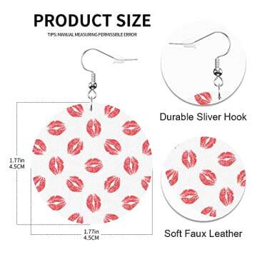 Swono Red Lips Round Faux Leather Earrings for Women Kiss Mark Lipstick Red Beauty Sexy Mouth Romantic Lovely Style Smooch Lightweight Double-Side Printed Drop Dangle Earring for Birthday Gift