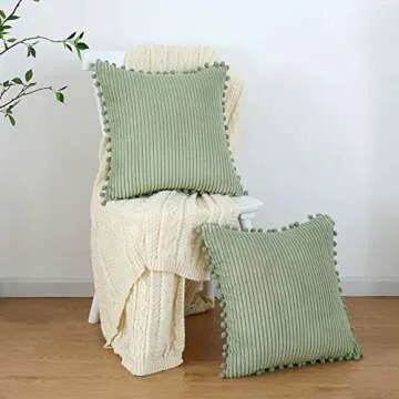 sykting Sage Green Throw Pillow Covers 18x18 inch Soft Striped Boho Farmhouse Decorative Pillow Covers with Pom Poms for Couch Sofa Bed Chair Outdoor Pack of 2