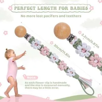 Show more Introducing the Symbolife Pacifier Clip, the perfect blend of style, safety, and functionality for your little one. Crafted with care and love, our clips feature a unique floral daisy design that brings a cheerful touch to any outfit. Made from premium natural cotton cord and finished with a chic boho wooden clip, you can trust that our product is not just adorable, but also incredibly safe. Each clip is BPA Free, Phthalate Free, Latex Free, and Lead Free, ensuring that your baby is protected from harmful chemicals. The round wooden clip has been expertly designed with plastic teeth that secure tightly without causing any damage to your baby’s clothing or discomfort against their skin.