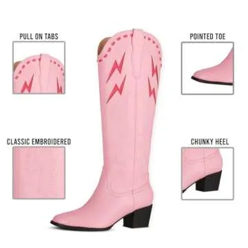 Show more Step out in style with these stunning wide calf cowboy boots that blend comfort and chic design effortlessly. Crafted with a vibrant pink hue and eye-catching embroidery, these boots are not just footwear; they are a statement piece. The unique chunky heel, measuring 2.16 inches, not only elongates your legs but also provides the perfect amount of lift without sacrificing comfort. Whether you're headed to a concert or a party, these boots will make you the center of attention.