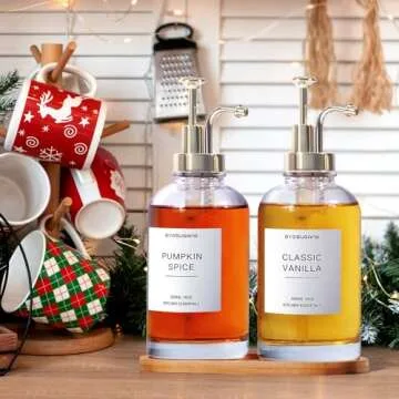 Show moreIntroducing the ultimate Syrup Dispenser Set from Gyosugang, specifically crafted to elevate your coffee experience and enhance your kitchen decor. This stylish set includes two beautifully designed glass syrup bottles, complemented by two BPA-free PVC gold pumps that not only add a touch of elegance but also provide seamless functionality. Each pump is designed to dispense approximately half a teaspoon (2 mL) of syrup with each press, making pouring smooth and efficient. The set also features a convenient funnel for easy filling and a chic bamboo tray to keep your syrup bottles neatly displayed. To top it all off, we have included an impressive 84-label set, consisting of 74 pre-printed syrup labels and 10 blank labels for your own creations. Whether you enjoy coffee, flavored syrups, or a variety of sauces, this dispenser set is your perfect companion!