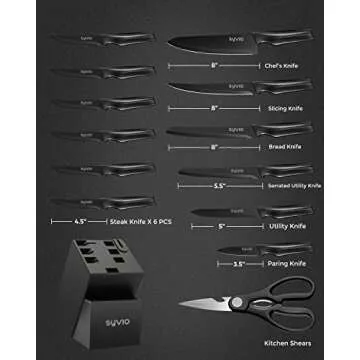 Show more Experience the art of culinary mastery with our extraordinary all-in-one knife set, crafted with precision and designed for both novice cooks and seasoned chefs alike. This comprehensive collection includes an impressive array of knives: an 8” Chef Knife for slicing and dicing, an 8” Slicing Knife for impeccable cuts, a robust 8” Bread Knife to tackle crusty loaves, a 5.5” Serrated Utility Knife, a versatile 5.5” Utility Knife, and 6 essential 4.5” Steak Knives for that perfect dinner presentation. Completing this kit is a 3.5” Paring Knife, stainless steel Kitchen Shears, and an elegantly designed Knife Block featuring a built-in sharpener.