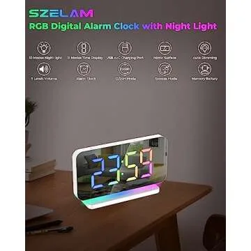Show more The SZELAM Digital Alarm Clock is not just a timepiece; it's a vibrant addition to your bedroom that combines functionality with aesthetics. Measuring an impressive 7.4 inches, this LED mirror clock features a high-definition display with an astonishing 11 color options, allowing you to tailor its look to fit your decor or mood. Whether you're waking up to colorful hues or using it as a stylish vanity mirror, this clock is designed to enhance your everyday experience. Not only does it serve as an alarm, but it also acts as a night light with 10 color modes, making it perfect for various settings—from kids' rooms to adult bedrooms.