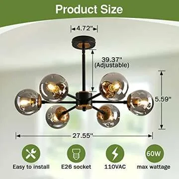 SZXYKEJI 6 Light Chandelier, Large Ceiling Light Fixture with Glass Classic, Black Pendent Lighting for Living Room Bedroom Bathroom Farmhouse Kitchen
