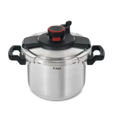The T-fal pressure cooker includes a secure locking system and built-in pressure indicators for safe operation.