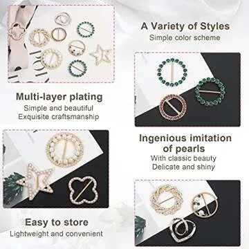 T-Shirt Clips 9 PCS, Clothes Corner Knotted Button, Fashion Alloy Pearl Rhinestone Circle Clip Buckle Round Shirt Silk Scarf Tie Clasp Ring Metal Decoratice Accessories for Women Girls (Type-1)