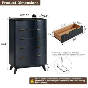 T4TREAM Fluted 5 Drawers Dresser, 48" Tall Modern Chest of Drawers with Faux Marble Top, Curved Profile Design, Wood Drawer Organizer for Bedroom, Living Room, Hallway, Entryway, Dark Grey