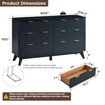 Measuring 54"W × 15.75"D × 32"H, this versatile dresser offers extensive possibilities for home organization. The spacious tabletop serves as an elegant canvas to showcase framed photos and artistic accents, while the six smooth-glide drawers provide efficient storage solutions for stowing clothing, bedding, cosmetics, jewelry, and more. Its design is perfect for various settings including the bedroom, living room, hallway, or entryway, allowing you to keep your space looking neat and tidy.