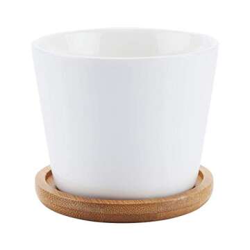 Show moreIntroducing the T4U 3.5 Inch Ceramic White Round Simple Design Succulent Plant Pot, the perfect home for your beloved succulents, herbs, and cacti. Crafted from high-quality ceramic, this adorable plant pot showcases a sleek and minimalist design that effortlessly complements any decor style. Measuring at a compact 8.5 x 8.5 x 6.9cm (3.375 x 3.375 x 2.75 inches), it fits seamlessly on your windowsill or office desk, bringing a touch of nature into your indoor space. Each pot comes with a complimentary bamboo tray, which not only enhances its aesthetic appeal but also helps to keep your surfaces clean by catching excess water. A small drainage hole at the bottom prevents overwatering, ensuring your plants thrive in their new home.