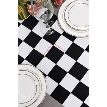 Show moreElevate your dining experience and special celebrations with our exquisite Black and White Checkerboard Table Runner. Crafted from durable polyester vinyl, this table runner not only offers a striking visual appeal but also stands up to everyday wear and tear, making it a fantastic choice for any occasion. Measuring a generous 12 x 72 inches, this versatile runner is designed to fit beautifully on any dining table, buffet, or dessert table, providing a perfect backdrop for various events such as anniversaries, birthday parties, weddings, and holiday gatherings.