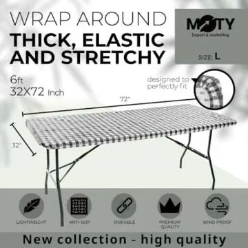Transform your dining experience! The versatile Tablecloth for Folding Table is the ultimate solution for busy families and those who enjoy hosting outdoor gatherings. Measuring 32 x 72 inches, this fitted tablecloth features a secure elastic rim that adapts snugly to any rectangular table size up to 3 inches thick. Perfectly designed to eliminate the hassle of shifting or blowing in the wind during parties or picnics, this product brings a blend of practicality and elegance...
