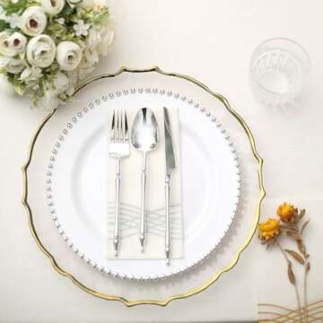 Tableclothsfactory 10 Pack | 10" White/Silver Beaded Rim Plastic Dinner Plates, Disposable Round Party Plates