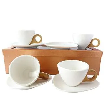 Tableware White Porcelain 5.5 Ounce Coffee Mug Set of 4 Wooden Handle with Saucer Ceramic Tea Cup