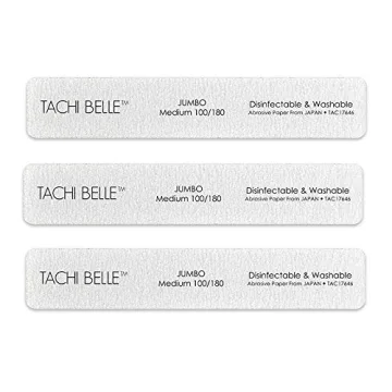 Show moreDiscover the exceptional quality of the Tachibelle Premium JAPAN Abrasive Jumbo Nail File. Perfectly designed for both enthusiasts and professionals, these nail files deliver an unparalleled experience in nail care. Crafted with the finest materials from Japan, this set includes three jumbo files with a unique dual-sided grit: 100 on one side for quick and effective shaping, and 180 on the other for smooth finishing. The cushioned core ensures a comfortable grip, allowing for quick and precise filing, whether you’re working on natural nails or acrylic extensions. This quality product is not just a tool but a gateway to achieving salon-quality nails at home.
