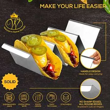 Show more Introducing the Taco Holder Stand - Set of 4 by Western Home Goods, the ultimate solution for taco lovers who want to enjoy their delicious creations without the mess! These dual-sided taco trays are uniquely designed to hold 2 to 3 tacos on each side, making them perfect for everything from casual family dinners to lively gatherings with friends. Crafted from premium food-grade stainless steel, these taco holders are not only stylish but also incredibly durable. And with the convenient handles, serving has never been easier! Each set comes beautifully packaged, making it an ideal gift for anyone who loves to cook or entertain.