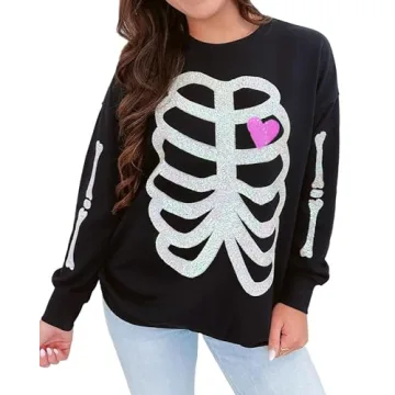 TACSTRUN Women's Halloween Sequin Sweatshirts Skeleton Spooky Ghost Graphic Long Sleeve Crewneck Pullover Sweater Tops,Black,X-Large