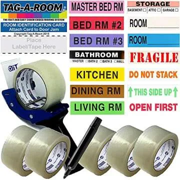 Tag-A-Room Pack and Move Kit - 525 Color-Coded Moving Labels, Door IDs, Tape Gun Dispenser, 6 Rolls of Packaging Tape, Dual-Tip Permanent Marker - Organize Your Move with Ease