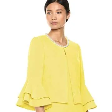 Show moreIntroducing the Tahari ASL Women's Petite Ruffle Sleeve Open Jacket Dress Set in a vibrant lemon yellow, perfect for adding a splash of color to your wardrobe. This elegant set features a beautifully designed open jacket adorned with ruffle sleeves, creating a delicate yet bold statement. The jewel neckline is tastefully embellished with faux pearl details, offering a touch of sophistication that is perfect for a variety of occasions. The accompanying dress comes with a back zipper closure and a stylish back hemline slit, providing comfort without compromising on style. Ideal for any fashion-forward woman, this set adjusts seamlessly from day to night, making it a versatile addition to your closet.