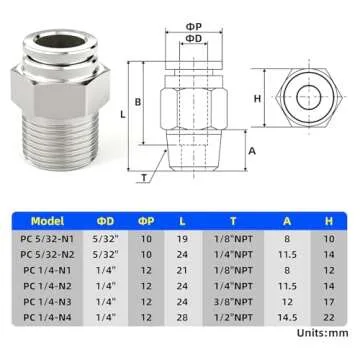Show more Discover the TAILONZ PNEUMATIC 304 Stainless Steel Male Straight Push-to-Connect Fittings, expertly crafted to bring efficiency and durability to your fluid transfer systems. Designed for seamless connections, these fittings are engineered from premium 304 stainless steel, ensuring corrosion resistance and longevity even under demanding conditions. Featuring a precise 1/4" tube OD and a corresponding 1/4" NPT thread, they offer straightforward integration into various pneumatic setups. With a remarkable maximum pressure of 435 PSI and a wide working temperature range of -4°F to 392°F, these push-in fittings are perfect for a variety of applications, whether in industrial settings or DIY projects. Experience reliability and ease of use with TAILONZ's expertly designed fittings in a convenient pack of 2.