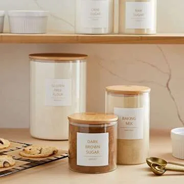 Talented Kitchen 157 Pantry Organization Labels for Food Storage Containers, Preprinted Gold All Caps on Matte White Vinyl Stickers + Numbers for Minimalist Style Kitchen (Water Resistant)